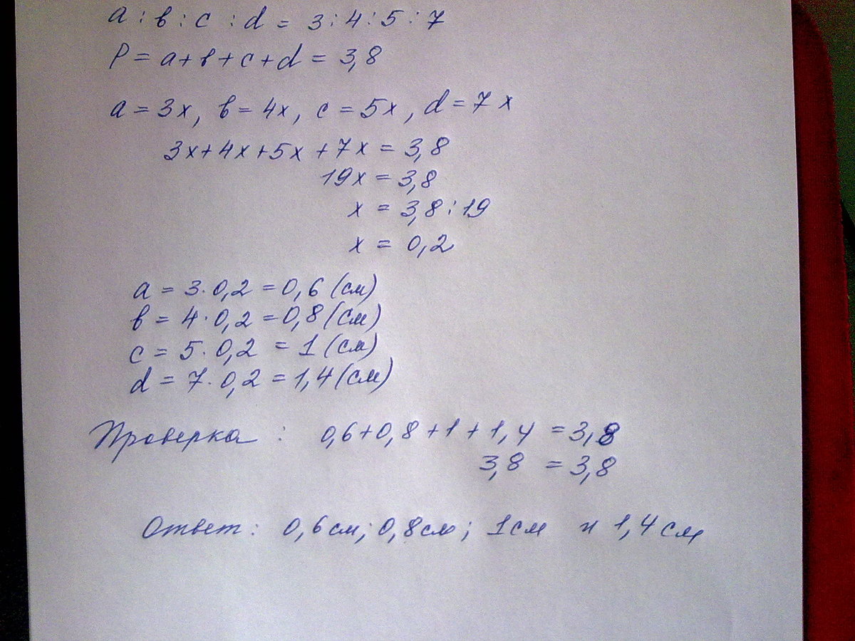 найдите длины сторон четырёхугольника если они пропорциональны числам 3,4,5 и 7,а периметр четырёхугольника равен 3,8см