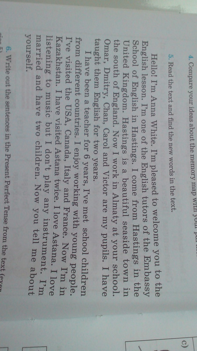 Привет! Меня зовут Анна Уайт. Я рада приветствовать вас на уроке английского языка. Я одна из репетиторов Embassy School of English ( это нельзя переводить, так как это название школы, если точнее - школа английского языка) в Гастингсе. Я родом из Гастингса, Великобритании. Гастингс - это приморский ( то есть, находящийся у моря) город на юге Лондона. Сейчас я работаю в Алматы в вашей школе. Омар, Дмитрий, Чен, Кэрол и Виктор мои ученики. Я учила их английскому в течение двух лет. А учителем я работаю 6 лет и повстречала учеников из разных стран. Мне нравится работать с молодыми людьми. Я была в США, Канаде, Италии и Франции. И сейчас я в Казахстане. Я дважды была в Астане. Я люблю Астану. Еще я люблю слушать музыку, но не играю ни на одном инструменте. Я замужем и у меня двое детей. А теперь ты рассказывай о себе.
