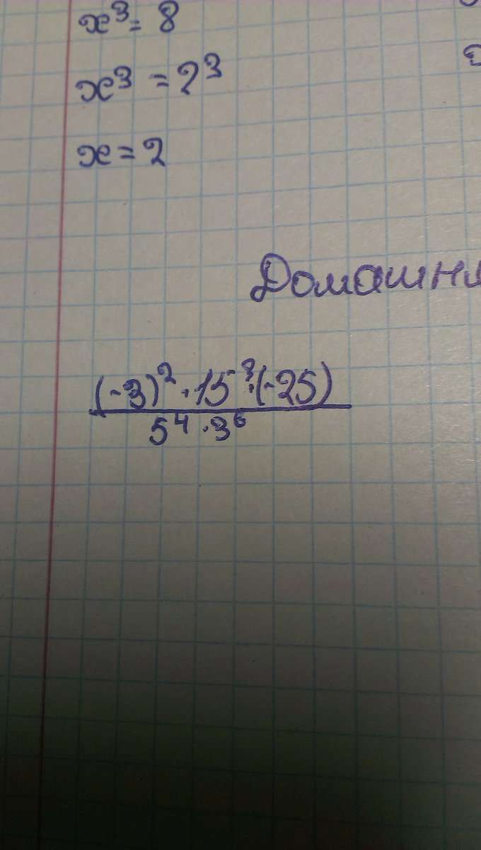 frac{ (-3)^{2} * 15^{3} *(-25)}{ 5^{4} * 3^{6} } = frac{ 3^{2} * 5^{3} * 3^{3} *- 5^{2} }{ 5^{4} * 3^{6} } = frac{-5}{3}
