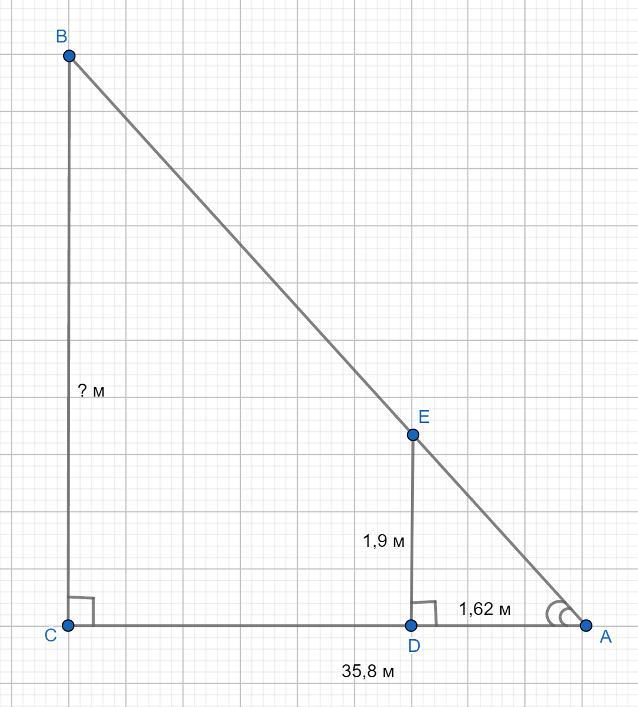 CB/ED = CA/DA; CB / 1,9 м = 35,8 м / 1,62 м; СВ = (35,8 м * 1,9 м)/1,62 м = 68,02 /1,62 м = 41 целая 160/162 м = 41 целая 80/81 метров.