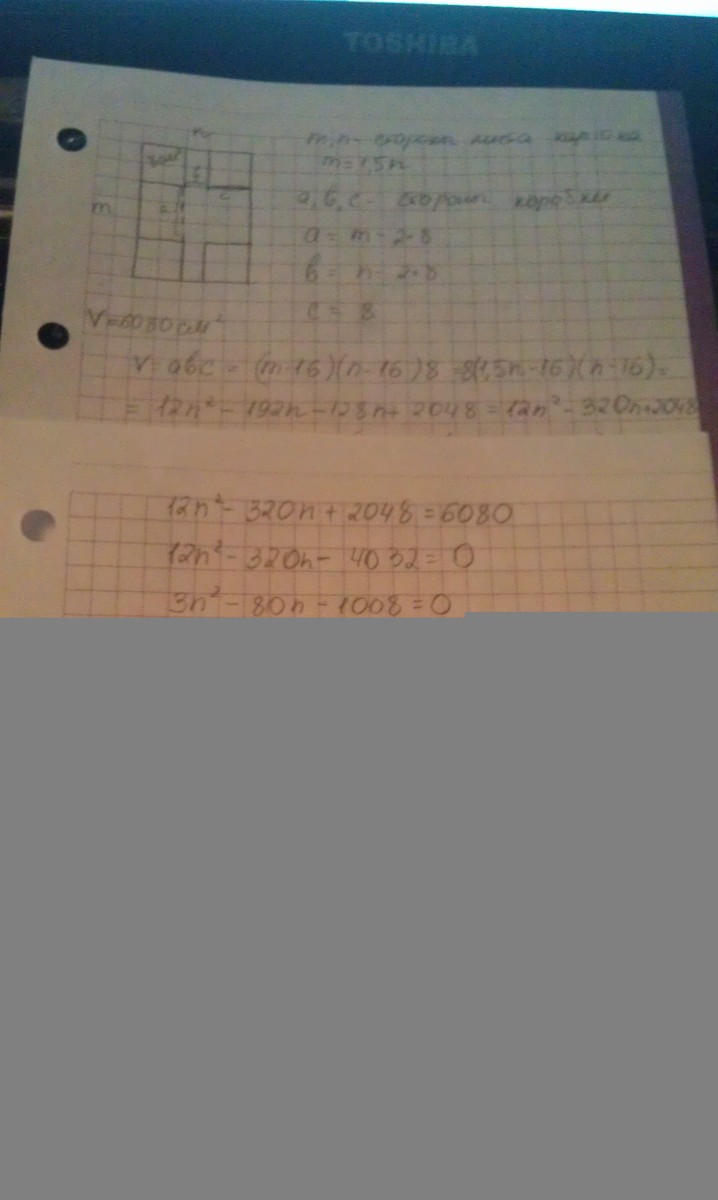 1.Имеется лист картона прямоугольной формы, длина которого в 1,5 раза больше его ширины. Из него можно изготовить открытую коробку объемом 6080 см в квадрате, вырезав по углам картона квадраты со стороной 8 см.Найдите размеры-длину и ширину листа картона.