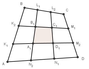 Дан выпуклый четырехугольник ABCD. Каждую из его сторон разделили на три равные части, как показано на рисунке. Площадь центрального выделенного четырехугольника A1B1C1D1 равна 1. Какое наибольшее значение может быть у площади четырехугольника ABCD.