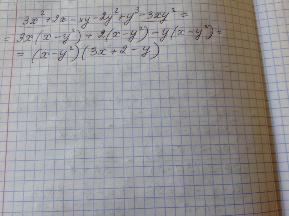 (3x²+2x-xy)-(2y²+y³-3xy²)=х(3х+2-у)-у²(2-у+3х)=(х-у²)(3х+2-у)