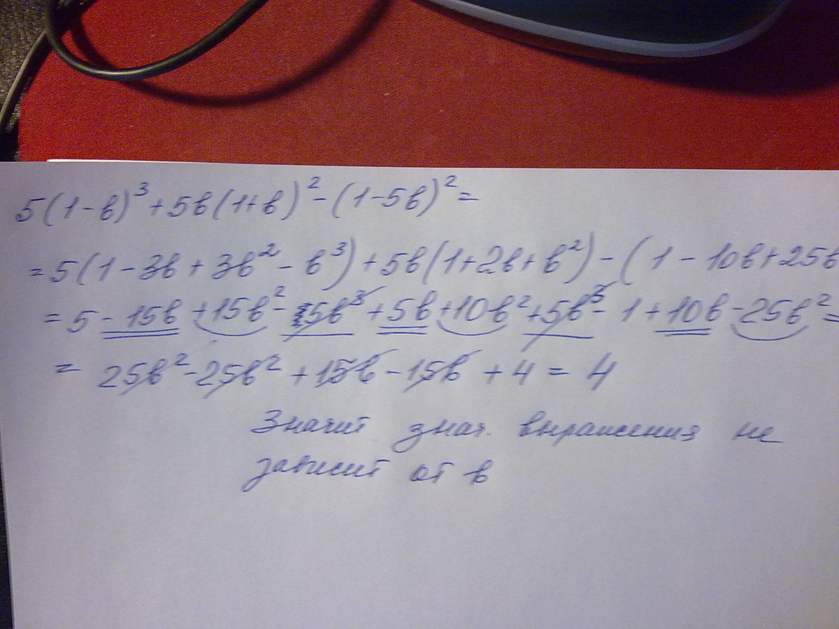 5(1-3b+3b^2-b^3)+5b(1+2b+b^2)-(1-10b+25b^2)=5-15b+15b^2-5b^3+5b+10b^2+5b^3-1+10b-25b^2=4(привели подобные слагаемые все с переменной b сократилось)