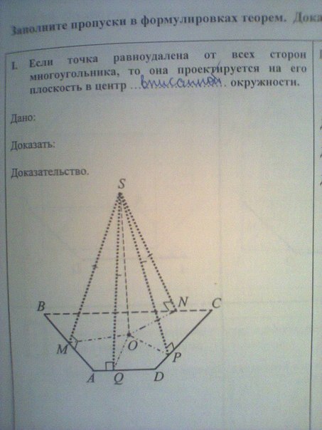 SO перпендикуляр к плоскости многоугольника. Рассмотрим треугольники SOM, SOQ, SOP, SON. Они все равны (прямоугольный, гипотенузы равны, а катет общий), тогда отрезки OM, OQ, OP, ON равны. Наконец, по теореме о трех перпендикулярах OM перпендикулярно AB, OQ - AD, OP - CD, ON - BC. Т.к. длины отрезков равны, а расстояние от точки до прямой измеряется по перпендикуляру, опущенному из этой точки на прямую, то О равноудалена от сторон многоугольника. Т.к. О принадлежит плоскости многоугольника, то О - центр вписанной окружности, ч.т.д.