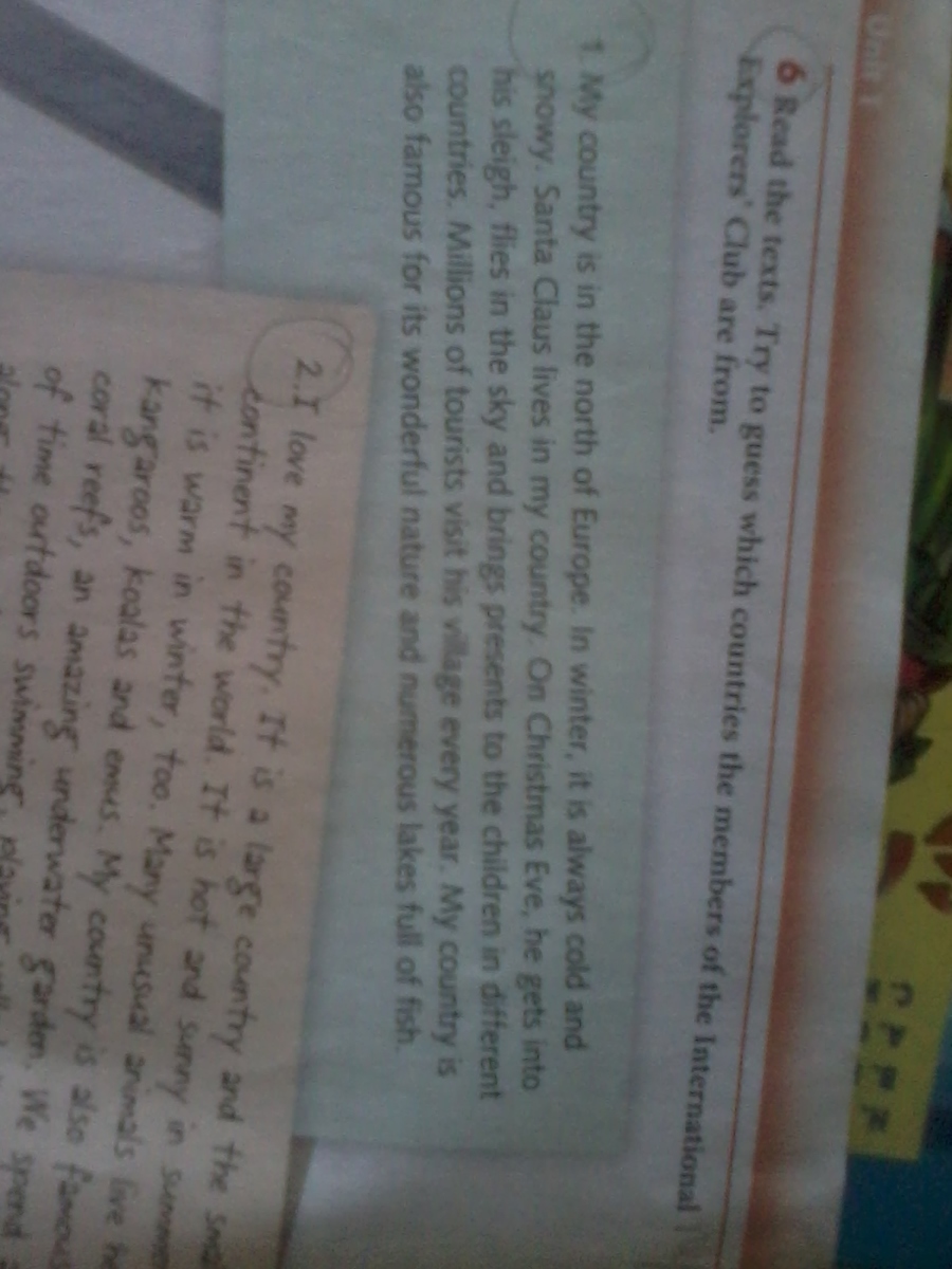 Моя страна на севере Европы. Зимой всегда холодно и снежно.Санта Клаус живет в моей стране.В канун Рождеста,он садиться в сани и несет подарки детям в разных странах.Миллионы туристов посещяют его деревню каждый год.Моя страна так же знаменита своей замечательной природой и многочисленными озерами,наполненными рыбами.