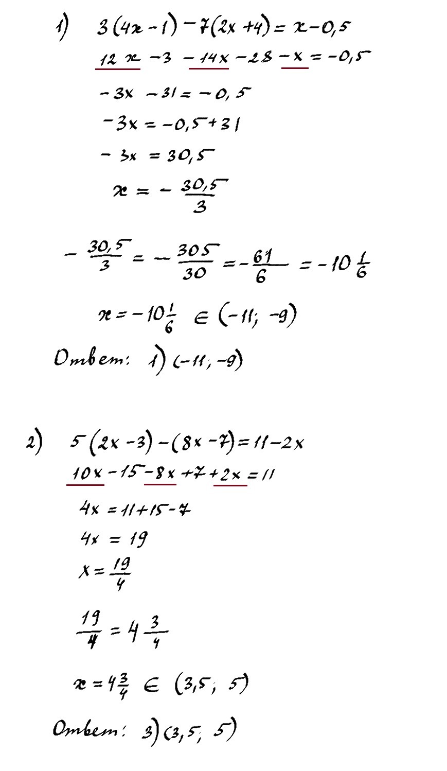 Укажите промежуток, которому принадлежит корень уравнения 3(4x-1)-7(2x+4)=x-0,5