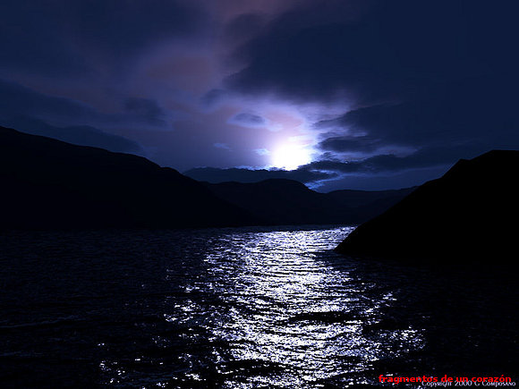 Вокруг царит тьма, а в небе зажигаются мириады звезд. Ближе к полуночи небо в одном месте светлеет, бледное зарево постепенно разгорается. Через несколько минут появляется полная луна, на которой даже с земли видны странные рисунки, созданные рельефом ее поверхности. Кто видит там лицо человека, кто диковинных животных или еще что-то другое.