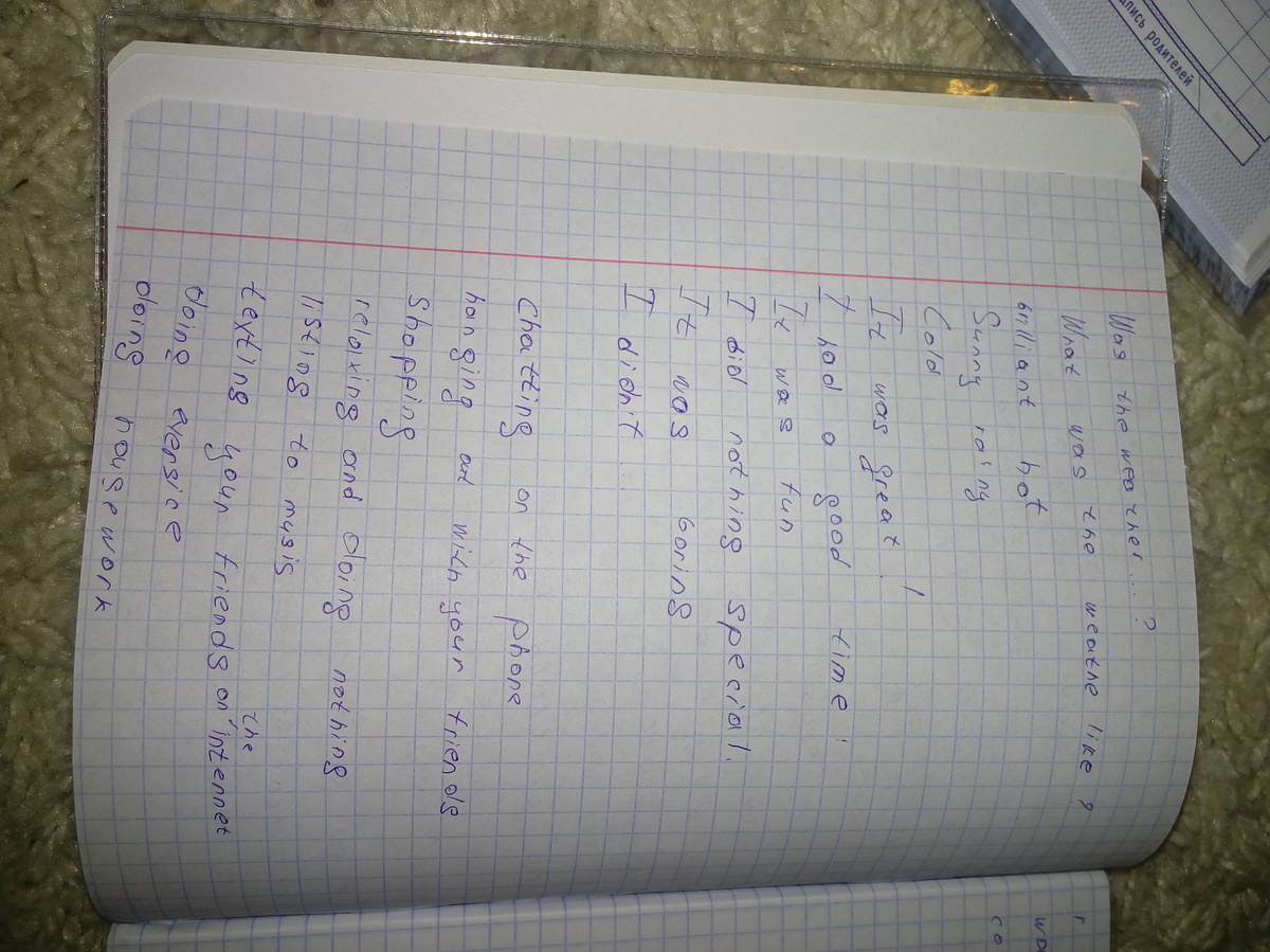 I had wonderful holidays. I spent my holidays at the seaside. I was there with my family and my friends. We sunbath, swam and played volleyball. I laid on the beach and read interesting book. The weather was sunny and hot.In the evening I went shopping with my friends. It was the best holidays.