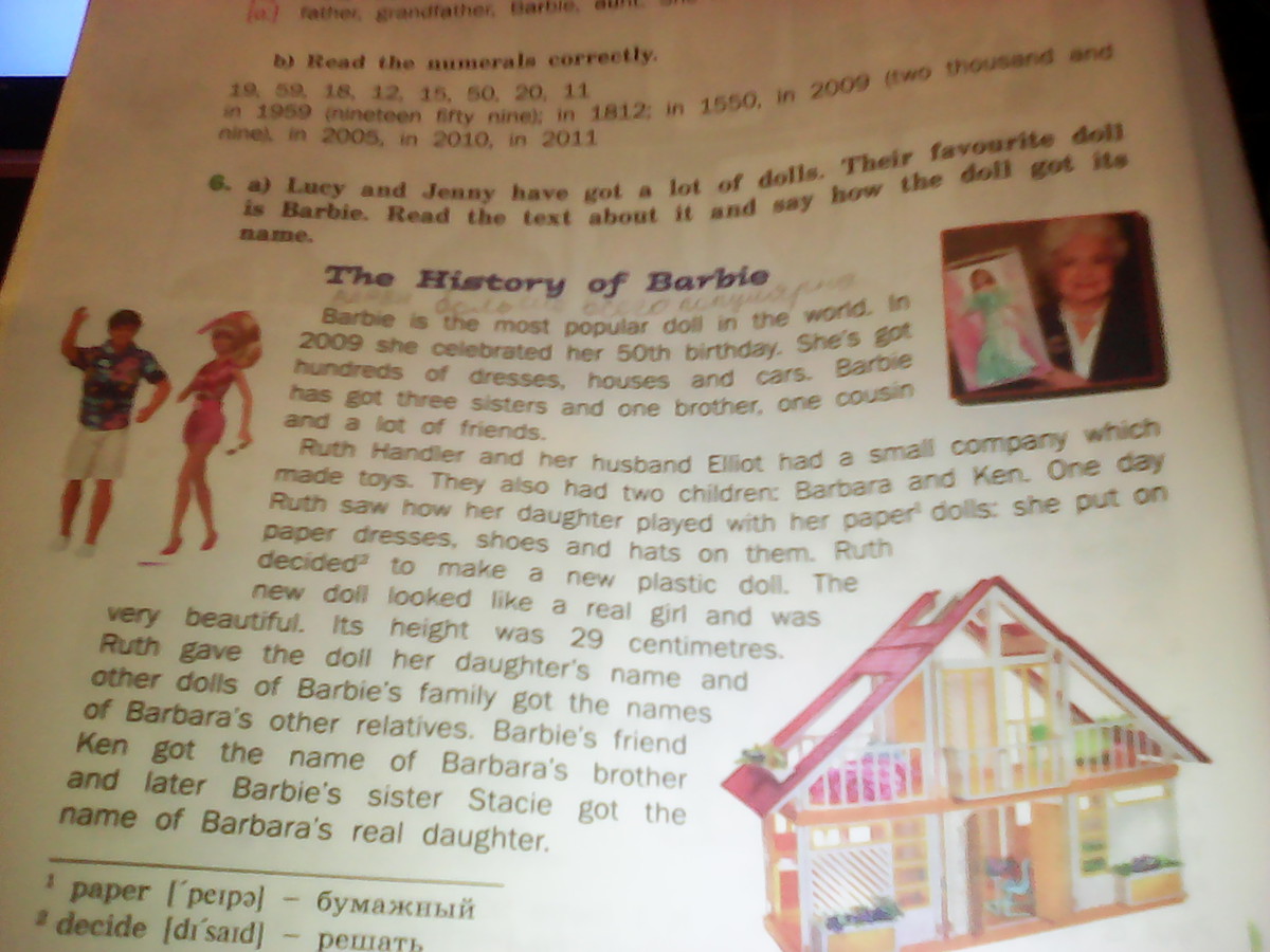Барби самая популярная кукла в мире. В каком-то там году она праздновала её 50-й день рождения. У нее есть что-то там от платьев, лошади и машины. У барби есть три сестры и один брат, один двоюродный и очень много друзей. У Рус Хэндлер и её мужа Эллиота есть небольшая компания по производству игрушек. Также у них есть два ребёнка: Барбара и Кен. В один прекрасный день Рус смотрела, как её дочь играла с бумажной куклой: она одевала её в бумажные платья, одежду и платья. Рус решила сделать новую куклу из пластика. Новая кукла выглядела как настоящая девочка и была очень красивой. Высота была 29 см. Рус дала кукле имя в честь её дочки и другие куклы из семьи барби тоже получили имена от членов семьи Барбары. Друг Барби, Кен, получил имя от брата Барбары и позже сестра Барби, Стейси, получила имя от настоящей дочки Барбары