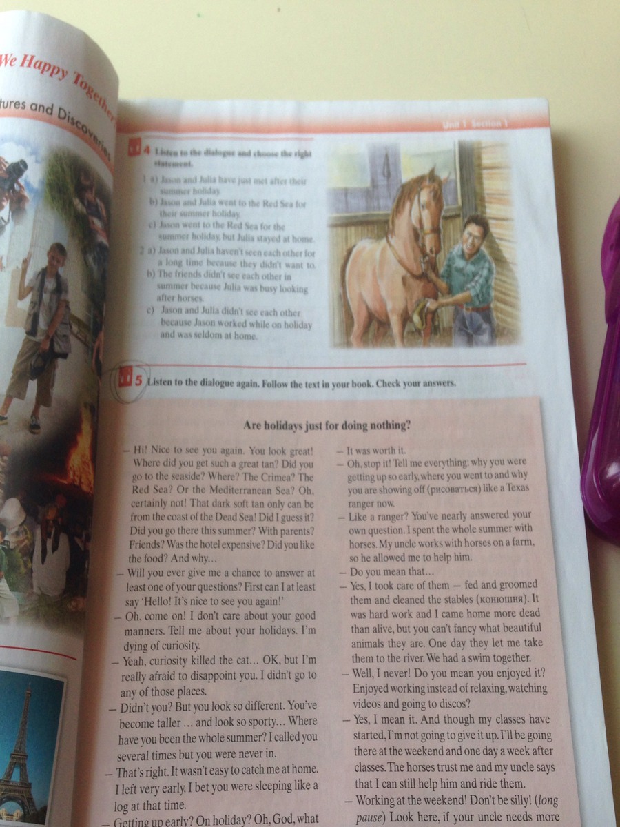 - Привет! Приятно видеть вас снова. Отлично выглядишь! Где ты такой большой загар? Вы ездили на море? Где? Крым? Красное море? Или Средиземное море? О, конечно, нет! Это темно-коричневый мягкий только может отменить от побережья Мертвого моря! Ты предполагаю, что это? Вы ездили туда этим летом? С родителями? Друзья? Был дорогой? Вам понравилась еда? И почему...- Вы когда-нибудь дать мне шанс, чтобы ответить по крайней мере один из ваших вопросов? Во-первых я могу по крайней мере сказать "Привет! It`s приятно видеть вас снова!"- Ой, да ладно! Я не `т заботятся о ваших хороших манер. Расскажите мне о ваших праздников. I`m умирают от любопытства.- Да, любопытство сгубило кошку ... ОК, но я `м действительно боится разочаровать вас. Я did`t перейти по любой из этих мест.- А не было `вас? Но вы так отличаются. `Ve стать выше ... и выглядеть так спортивный ... Где ты был все лето? Я назвал вам несколько раз, но вы никогда не были в.- `S право. Это wasn`t легко поймать меня дома. Я оставил очень рано. Бьюсь об заклад, вы спали как убитые в то время.- Вставать рано? На выходных? О, Боже, за что?- Это стоило того.- Ах, оставьте! Расскажи мне все: почему вы вставали так рано, где вы пошли и почему вы хвастаются, как рейнджер Техас в настоящее время.- Как рейнджер? `Ve почти ответили на свой guestion. Я провел все лето с лошадьми. Мой дядя работает с лошадьми на ферме, так что он позволил мне помочь ему.- Есть ли у вас что ... Meen- Да, я смотрю заботиться о них - кормить и ухоженные их и очистить конюшни. Это была тяжелая работа, и я пришел домой скорее мертв, чем жив, но вы не можете фантазии какие красивые животные они. Однажды они меня принять их к реке. Мы были поплавать вместе.- Ну я никогда! Вы имеете в виду, что вам понравилось? Понравилась работы вместо отдыха, просмотра видео и собирается на дискотеки?- Да, я имею в виду его. И хотя мои классы начали, I`m не собираюсь давать его. I `LL идти туда в выходные, и один день в неделю после занятий. Лошади, поверьте мне, и мой дядя говорит, что я все еще могу помочь ему и ездить на них.- Работа в weekand! Don`t глупо! (долгая пауза) Послушай, если твой дядя нуждается в большей помощи, я могу прийти, слишком?