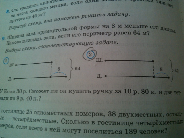 ширина зала прямоугольной формы на 8 м, меньше его длины. какова площадь зала, если его периметр равен 64 м.