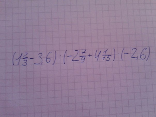 (1 2/3-3,6) : (-2 7/9+4 1/15)·(-2,6)=преобразуем все десятичные дроби в обыкновенные