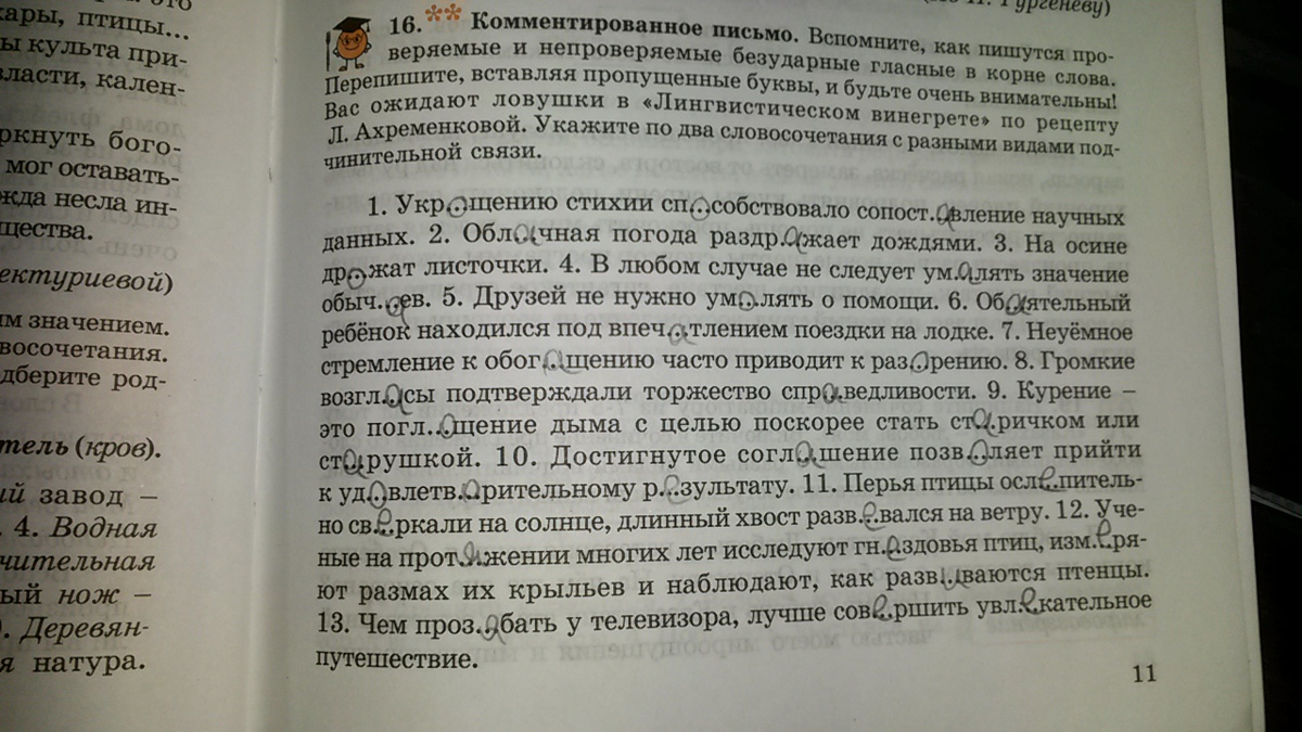 1 Укрощению стихии способствовало сопоставление научных данных.2 Облачная погода рахдражает дождями.3 На осине дрожат листочки .4В любом случае не стоит умилять значение обычаев.5 Друзей не нужно умолять о помощи.6 Обаятельный ребенок находился по впечатлением поездки на лодке. 7 Неуёмное стремление к обогащению часто приводит к разорению. 8 Громкие возгласы подтверждали торжество справедливости.9 Курение -это поглощение дыма с целью поскорее стать старичками и старушкой. 10 Достигнутое соглашение позволяет прийти к удовлетворительному результату 11 Перья птицы ослепительно сверкали на солнце , длинный хвост развивался на ветру. 12 Ученые на протяжении многих лет исследуют гнездовья птиц , измеряют размах их крыльев и наблюдают , как развиваются птенцы .13 Чем прозябать у телевизора, лучше совершить увлекательное путешествие.
