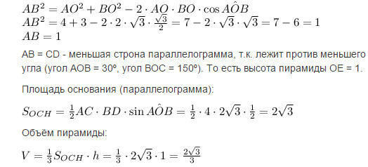 найдите обьем пирамиды в основании которой лежит параллелограмм с диагоналями 4см и 2корней из 3 см если угол между ними 30 градусов а высота пирамиды равна меньшей стороне основания.