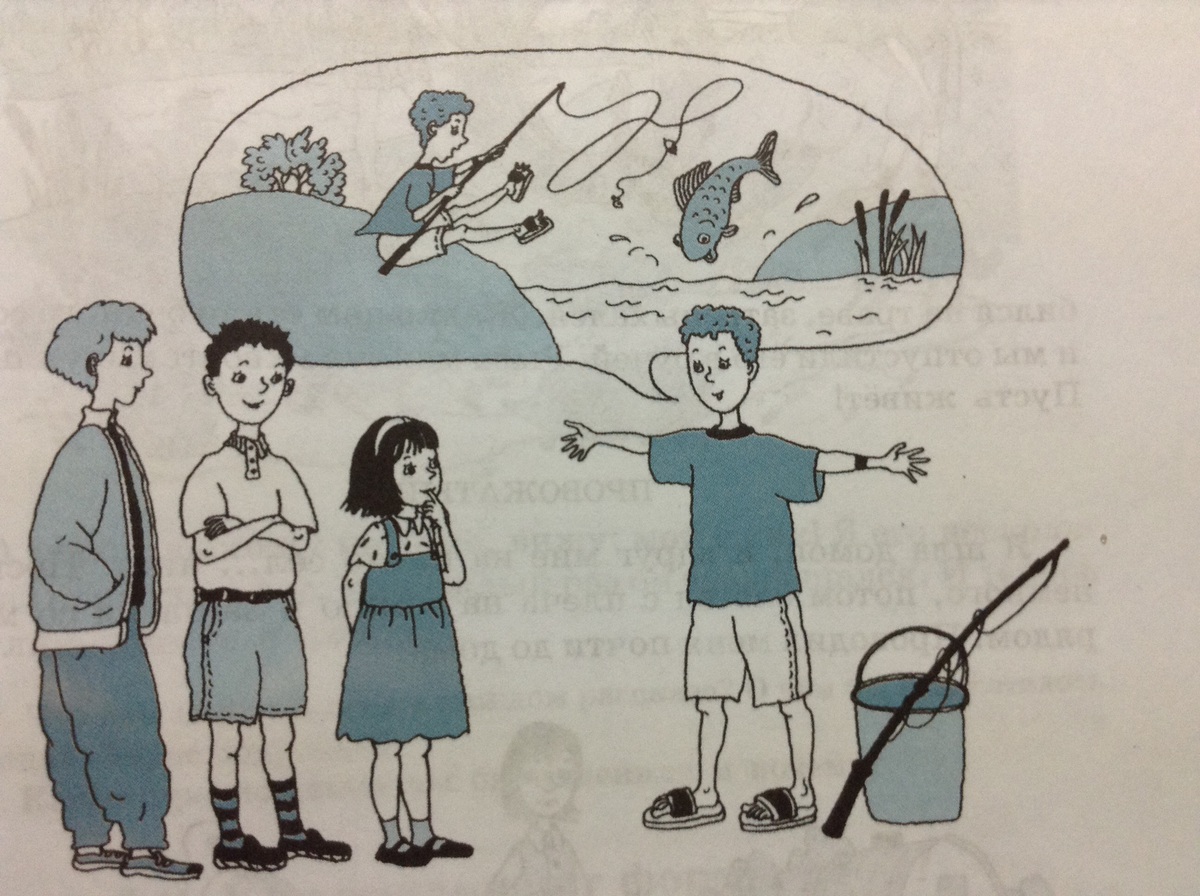Мальчик рассказывает своим друзьям о том как он пошёл на рыбалку и упустил рыбу с крючка