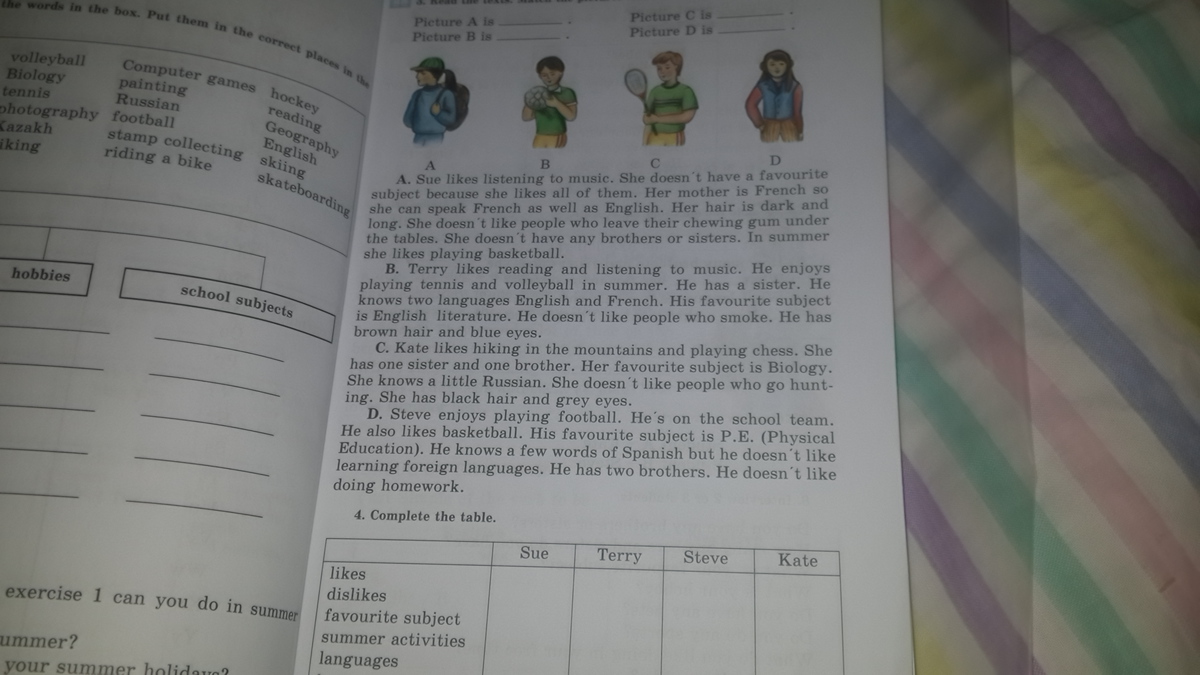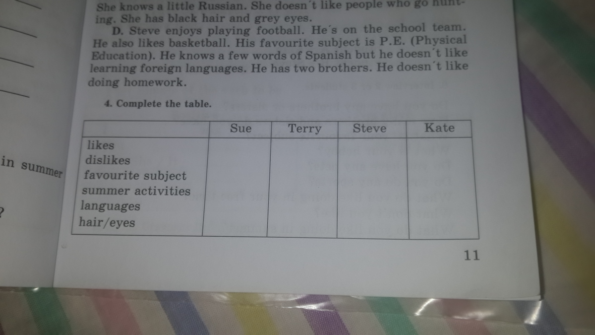 4.Sue - listening to music. Likes all subjects. Knows English and French. Doesn't like people who leave their chewing gum under the tables. In summer she likes playing basketball. She has dark long hair. Terry - reading and listening to music. In summer he likes playing tennis and volleyball. Languages- English and French. Favorite subject- english literature. Doesn't like people who smoke. Brown hair and blue eyes. Kate - likes hiking in the mountains and playing chess. Favorite subject- biology. She knows a little russian and English. Doesn't like people who go hunting. Black hair and grey eyes. Steve - enjoys playing football and basketball. Favorite subject- physical education. He knows a few words of Spanish. He doesn't like learning foreign languages and doing homework. Brown hair