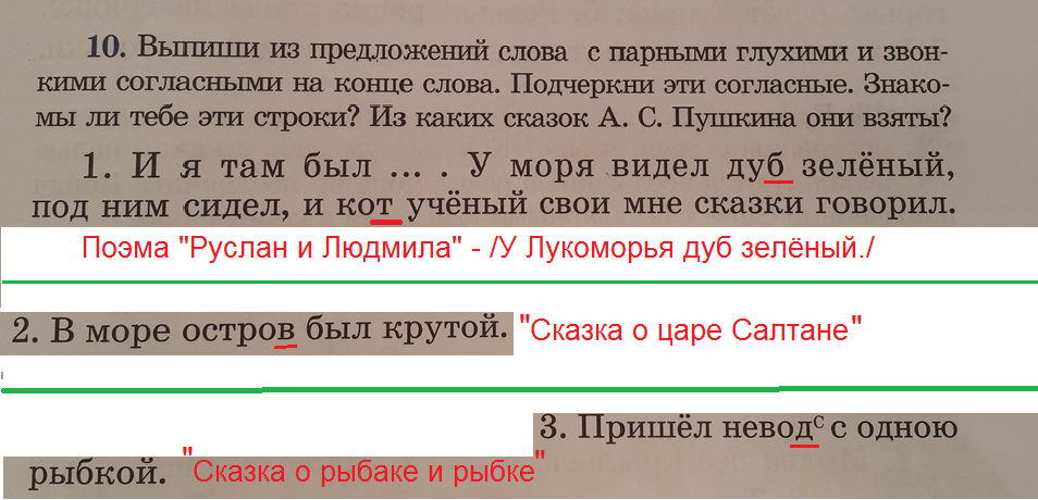 Выпиши из предложений слова с парными глухими и звонкими согласными на конце слова. Подчеркни эти согласные. Знакомы ли тебе эти строки? Из каких сказок А.С.Пушкина они взяты?