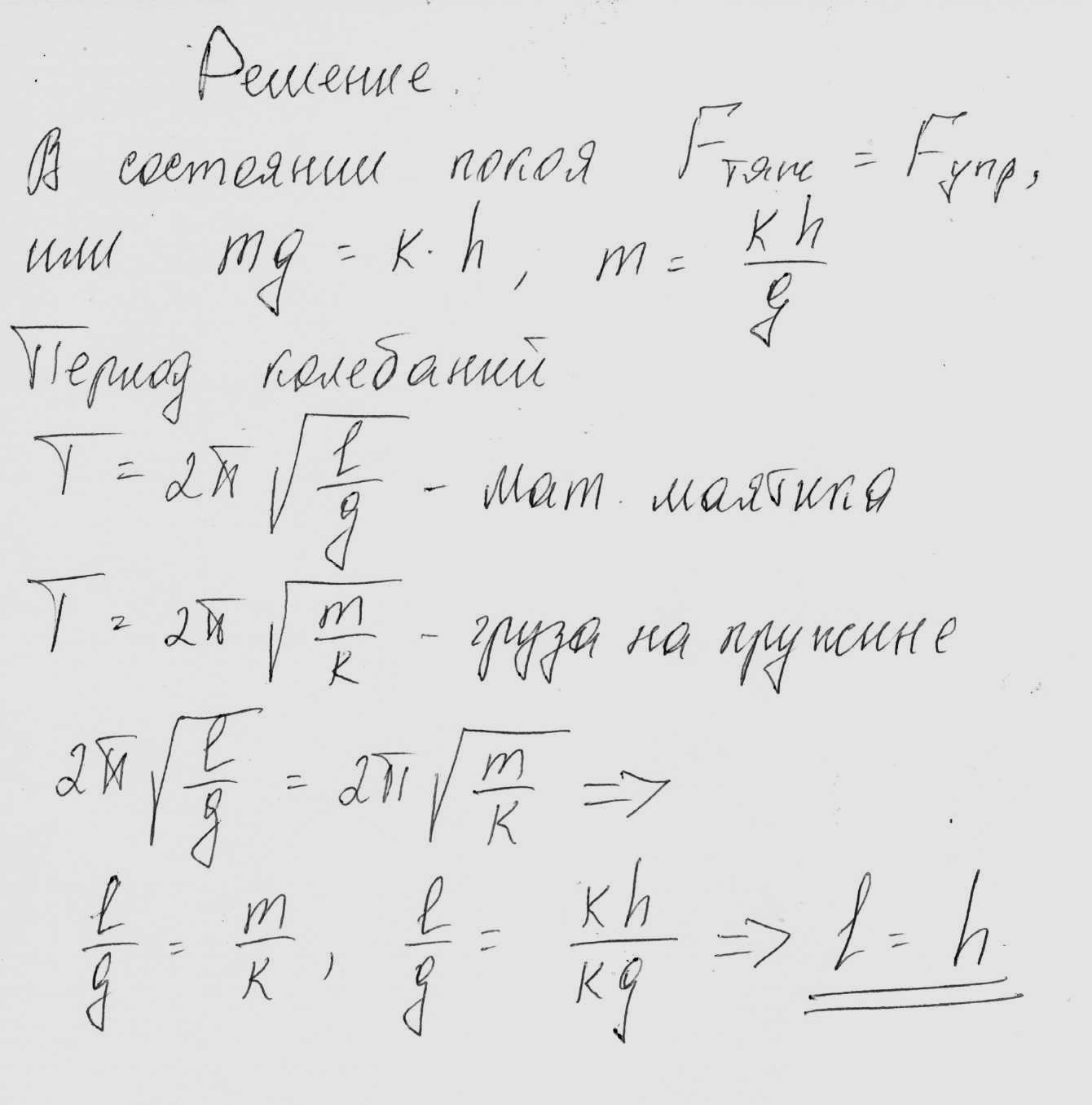какова должна быть длина математического маятника, чтобы период его колебаний совпадал с периодом колебаний груза,растягивающего пружину в состоянии покоя на h см