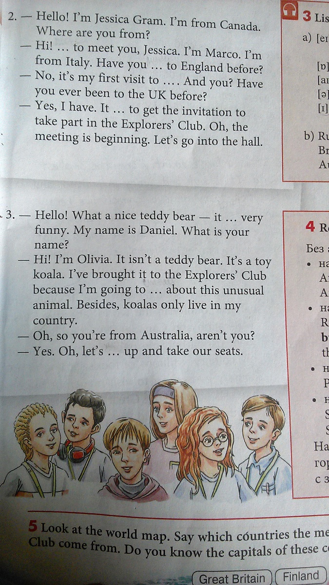 - Привет. Меня зовут Оливия. Это не плюшевый медведь. Это игрушечная коала. Я принесла её в клуб Открывателей, потому что собираюсь (tell) про это необычное животное. Кроме того они живут только в моей стране.