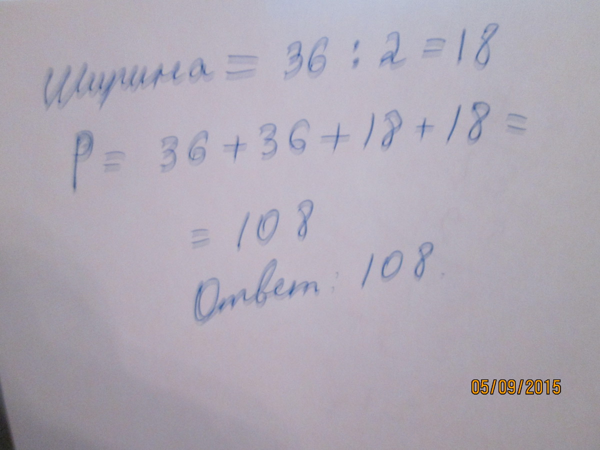 Если длина 36, а ширина в два раза меньше, то 36:2=18 - ширина прямоугольника