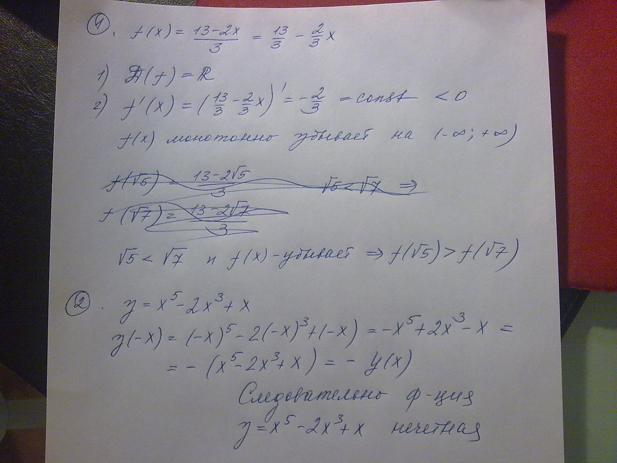 надо: Исследовать функцию y=f(x), где f(x)=(13-2x)/3 на монотонность. результаты исследования сравнить. f(корень из 5) и f(корень из 7)