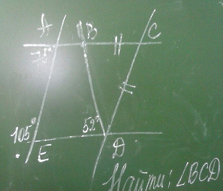 углы в75 и 105 градусов-внутренние односторонние и в сумме=180, значит, прямые АС и ЕД- параллельные. Тогда угол СВД=ВДЕ=52 (как накрест лежащие) треуг. ВСД- равнобедр., с углами при основании 52. Отсюда искомый угол = 180-52*2=76