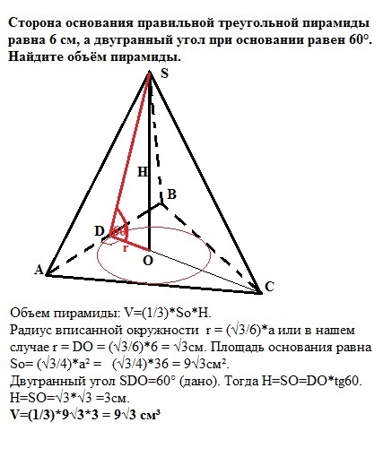 Сторона основания правильной треугольной пирамиды равна 6 см, а двугранный угол при основании равен 60 градусов. Найдите объём пирамиды