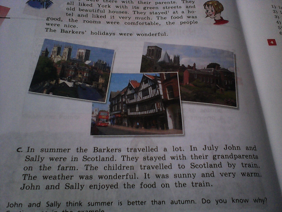 Летом Баркери много путешествували. В июле Джон и Салли были в Шотландии. Они остались со своими бабушкой и дедушкой на ферема. Дети путешествували к Шотландии поездом. Погода была чудесной. Было солнечно и очень жарко. Джон и Салли наслаждались едой в поезде.
