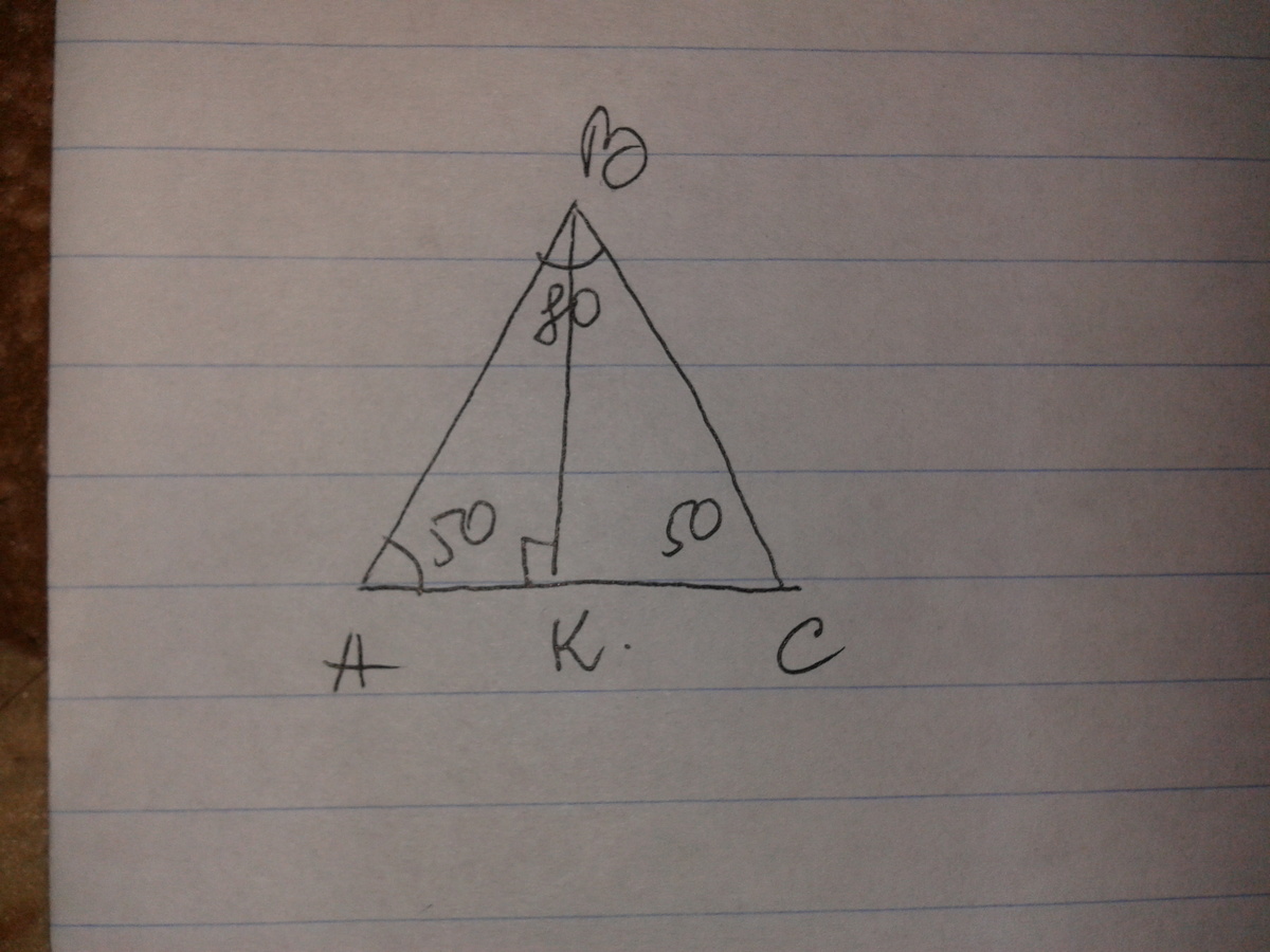 В равнобедренном треугольнике с основанием AC угол С= 50° , угол B=80° BK- биссектриса треугольника ABC. Определите углы треугольника ABK.