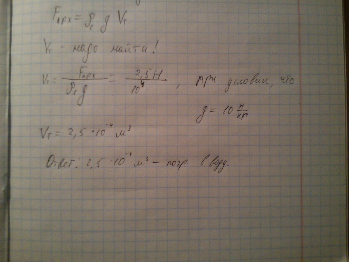 №Алюминиевый брусок массой 2.7кг частично погружен в воду.При этом на брусок действует архимедова сила 2.5H.Какая часть бруска погружена в воду?
