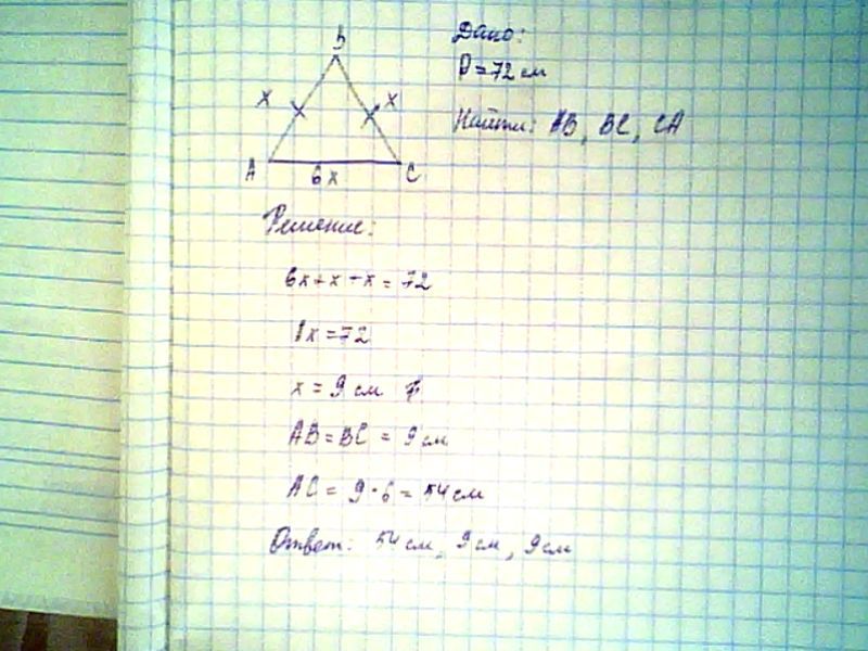 В равнобедренном треугольнике с периметром 72 см основание в 6 раз больше