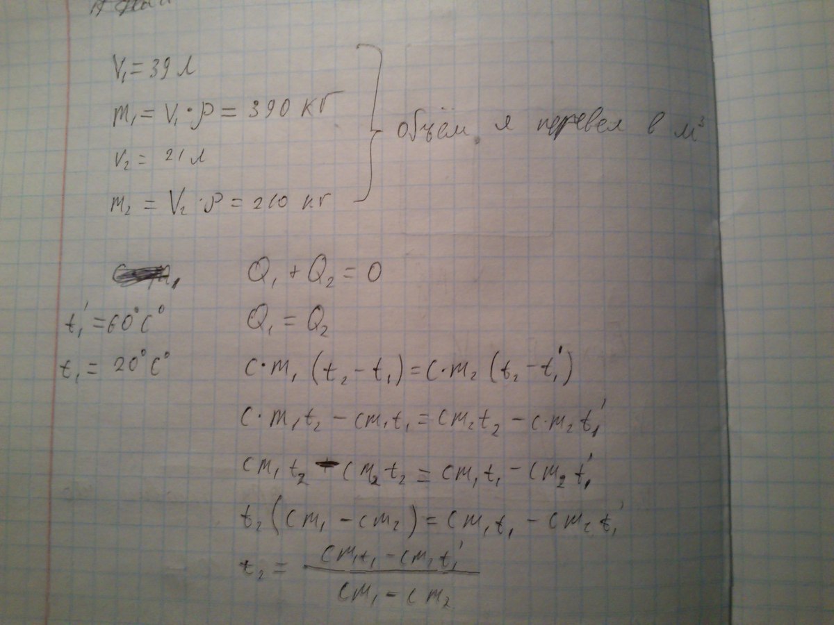 Смешали 39 л. воды при температуре 20 градусов цельсия и 21 л. при температуре 60 градусов цельсия. Определите температуру смеси.