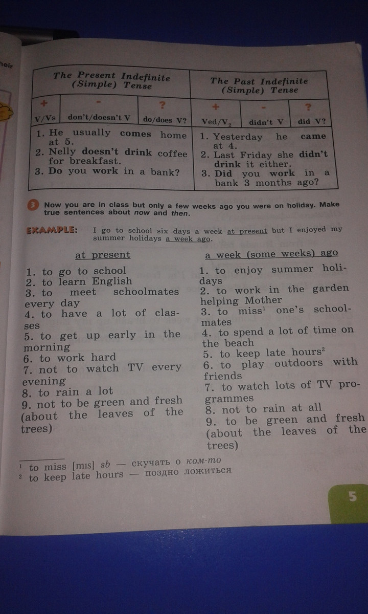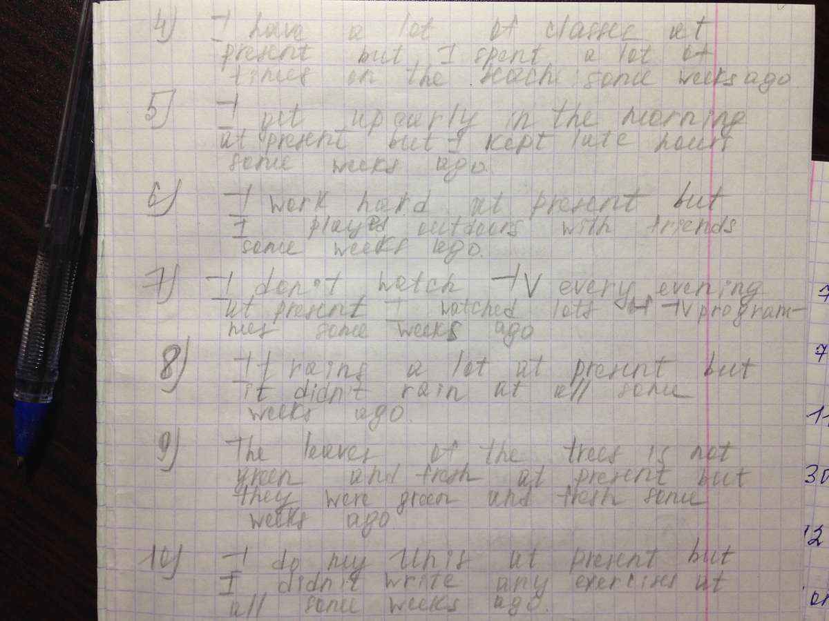 1. I go to school six days a week at present but I enjoyed my summer holidays a week ago. 2. I learn English a few times a week at present but I worked in the garden helping me Mother a week ago. 3. I meet me schoolmates every day when I go th school at present but I missed me schoolmates some week ago.