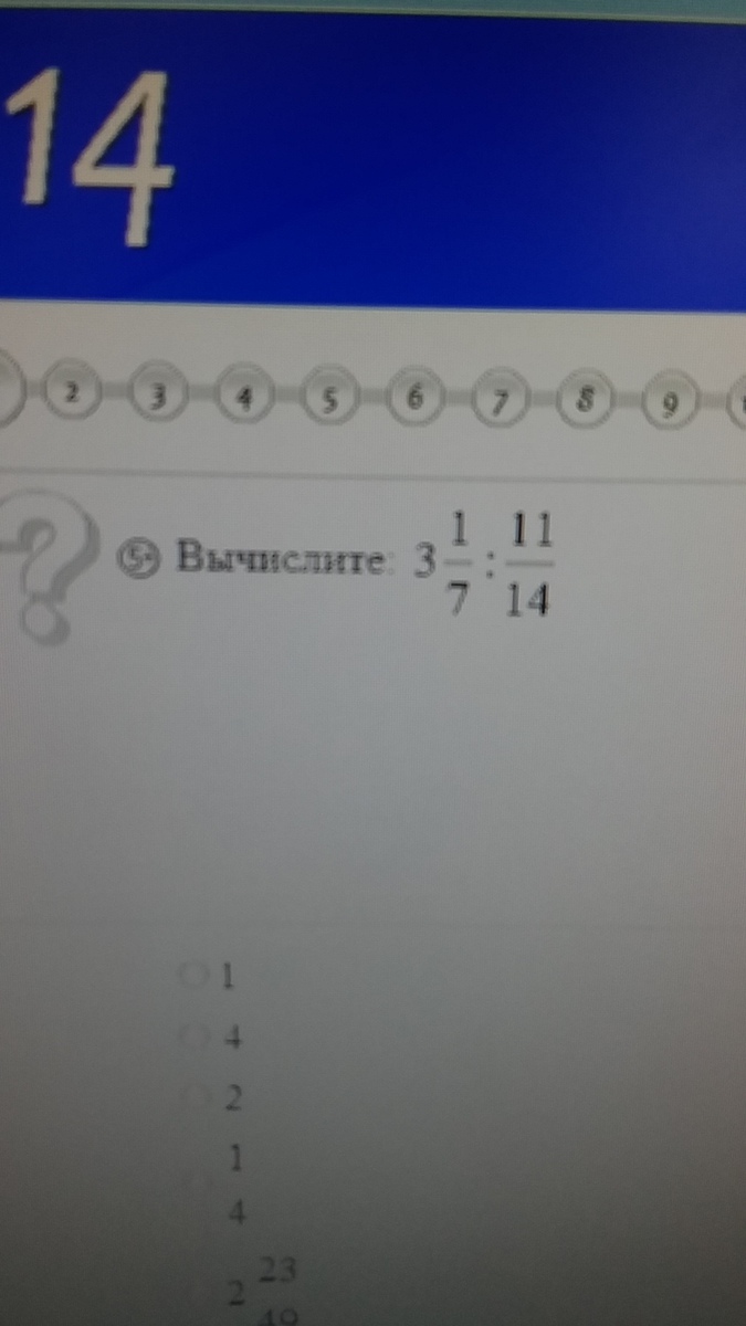 переводим дроби 22/7: 11/14, при деление дробей вторая дробь переворачиваеться и деление заменяем умножением: получаеться 22/7* 14/11, сокращаем; 2/1*2/1= 4/1=4