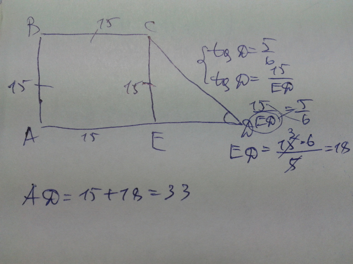 тангенс острого угла прямоугольной трапеции равен 5/6 найдите ее большее основание если меньшее основание равно высоте и равно 15