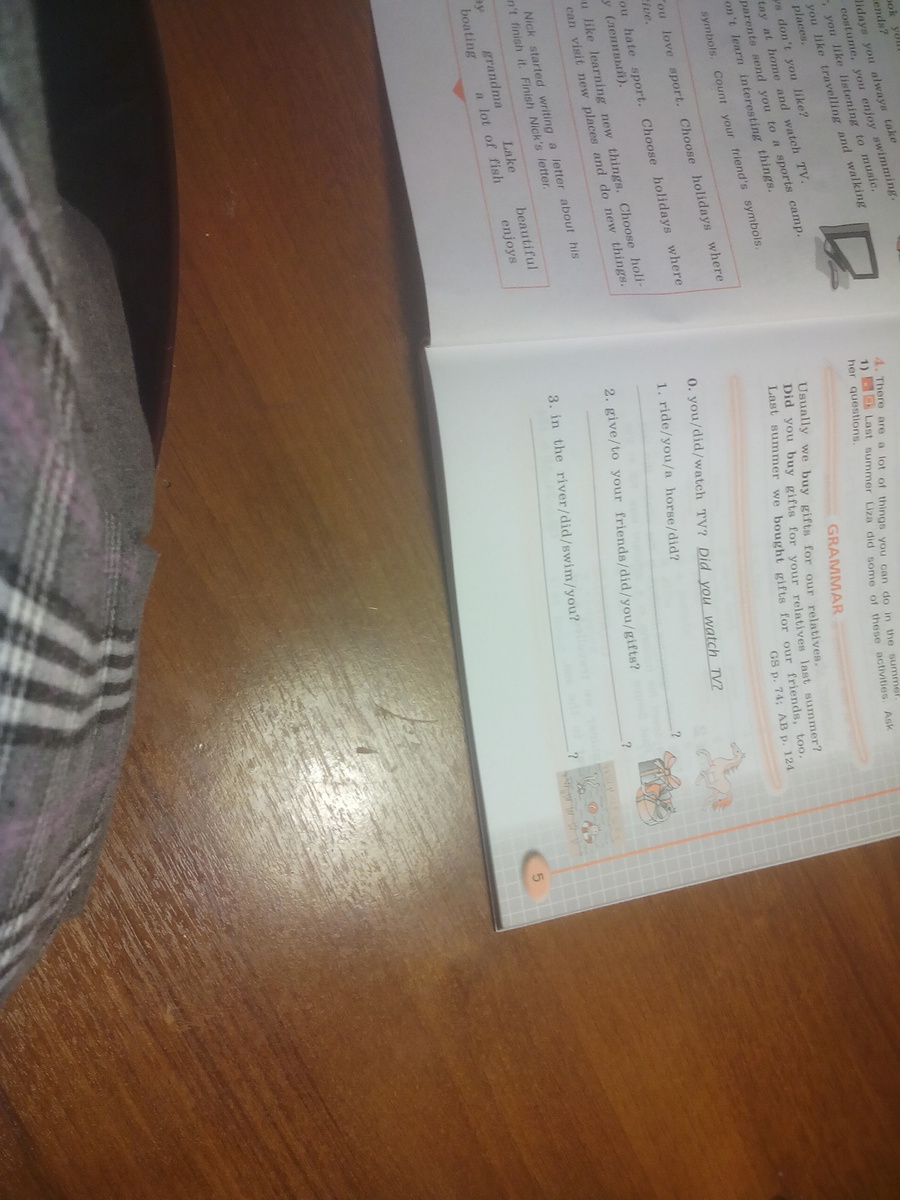 1) Did you ride a horse? 2) Did you give gifts to your friends? 3) Did you swim in the river?