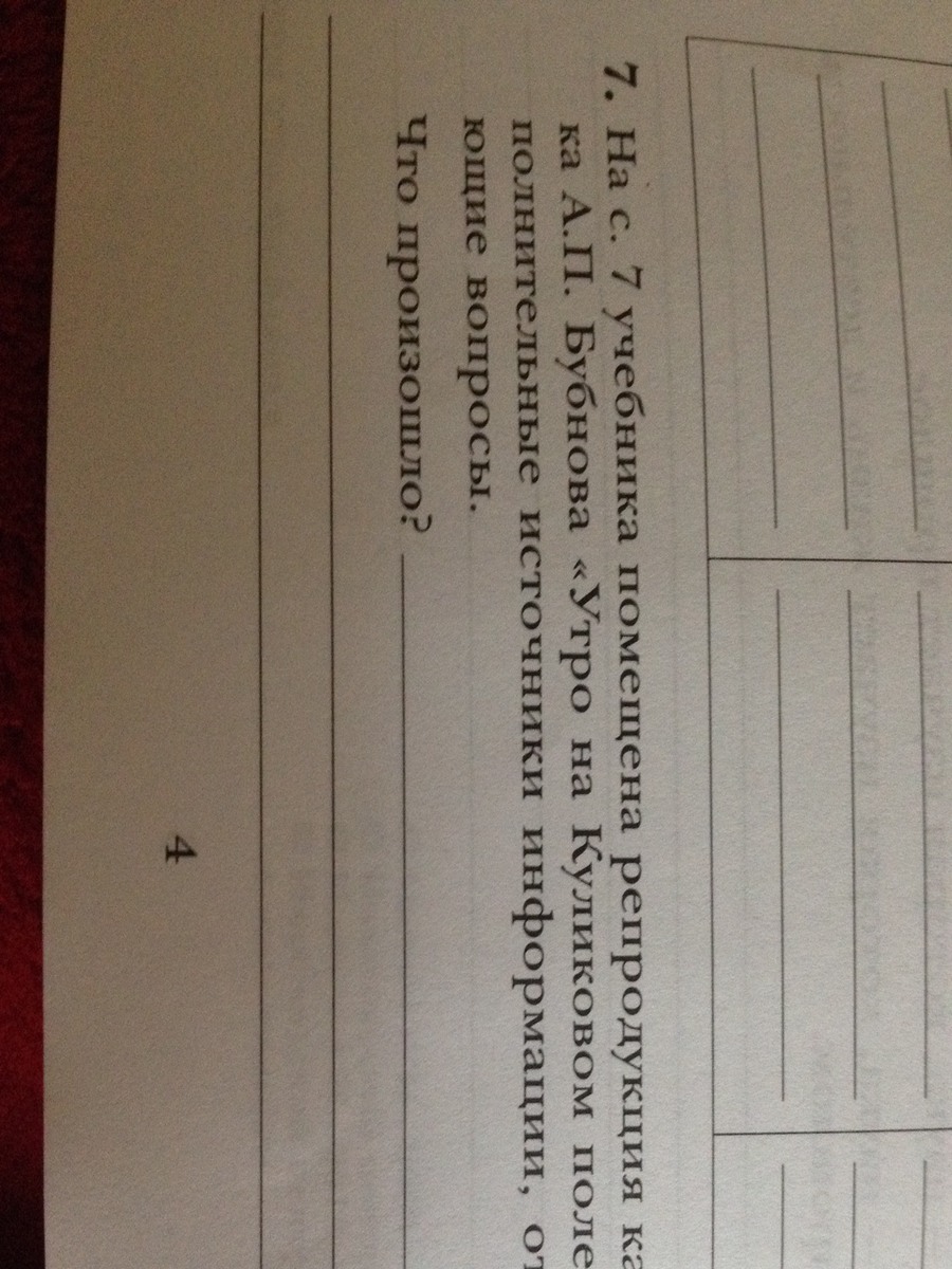 На странице 7 в учебнике помещена репродукция картины художника А.П.Бубнова "Утро на Куликовом поле". Используя дополнительные источники информации, ответьте на следующие вопросы. Вопросы на фотографиях. Помогите пожалуйста!!!