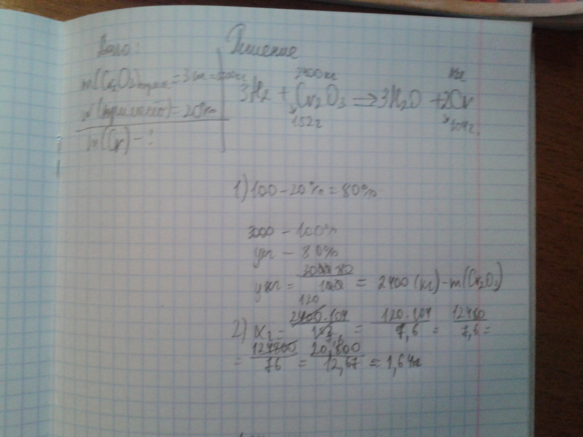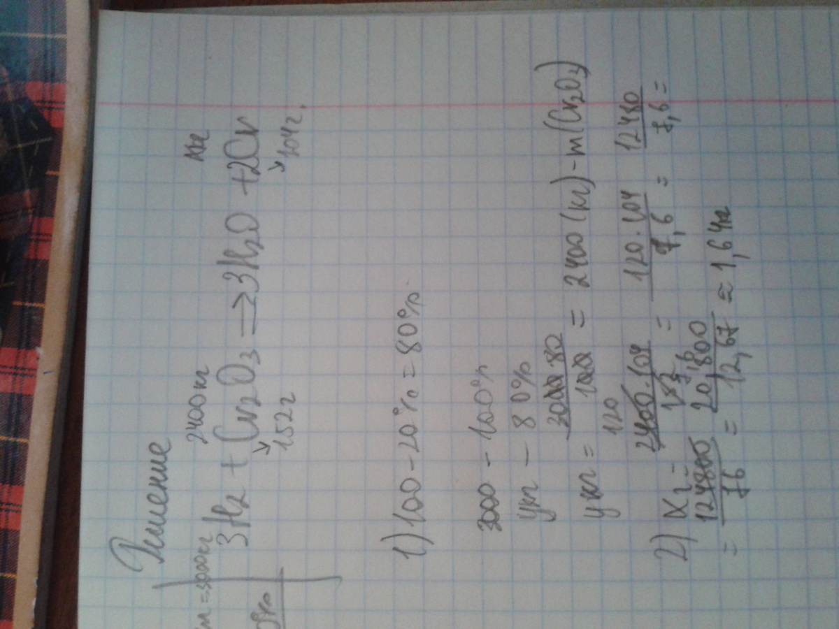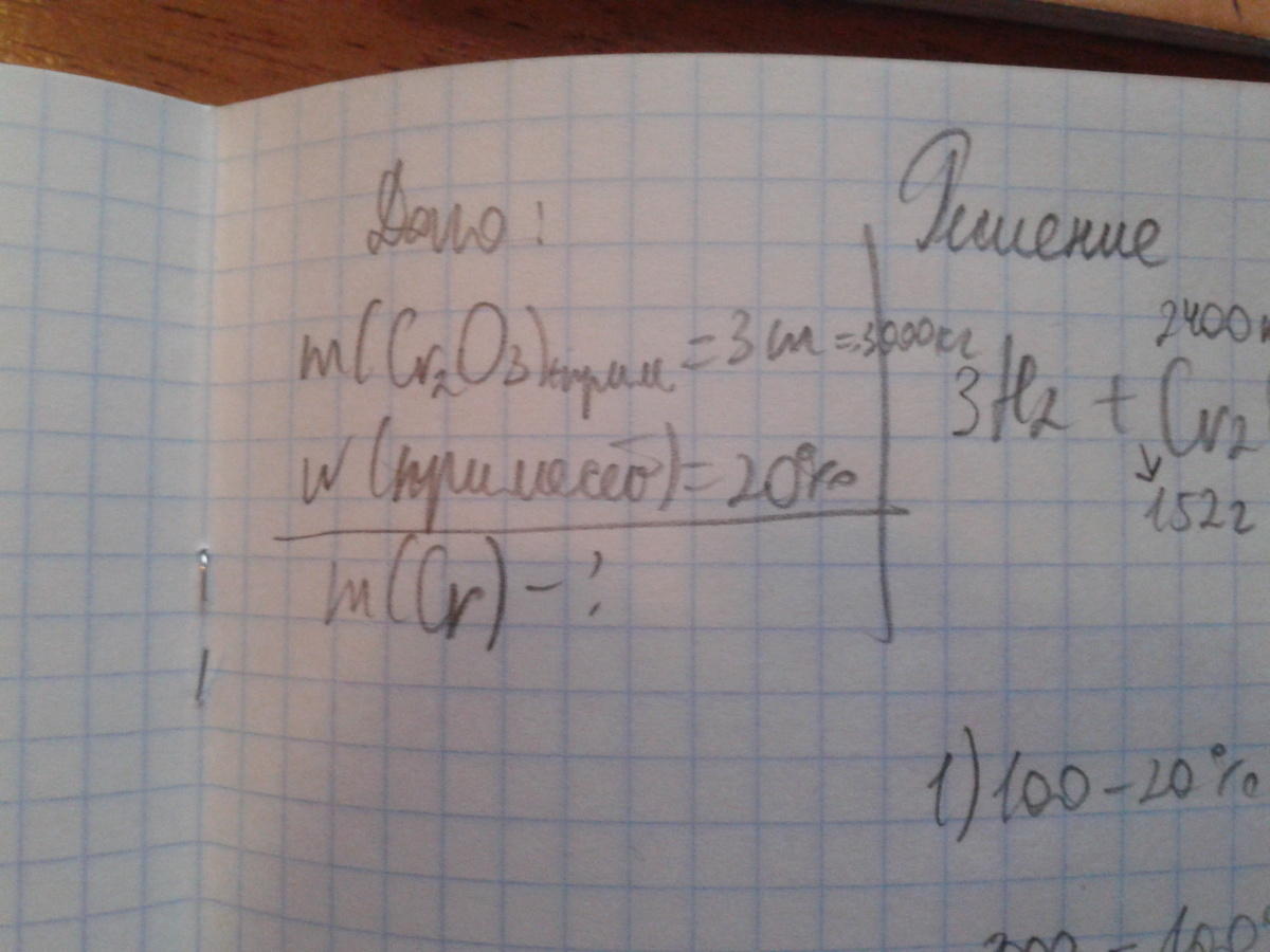 Вычислите массу хрома которую можно получить при взаимодействии водорода с тремя тоннами оксида хрома (|||)(с долей примесей в нем 20%)