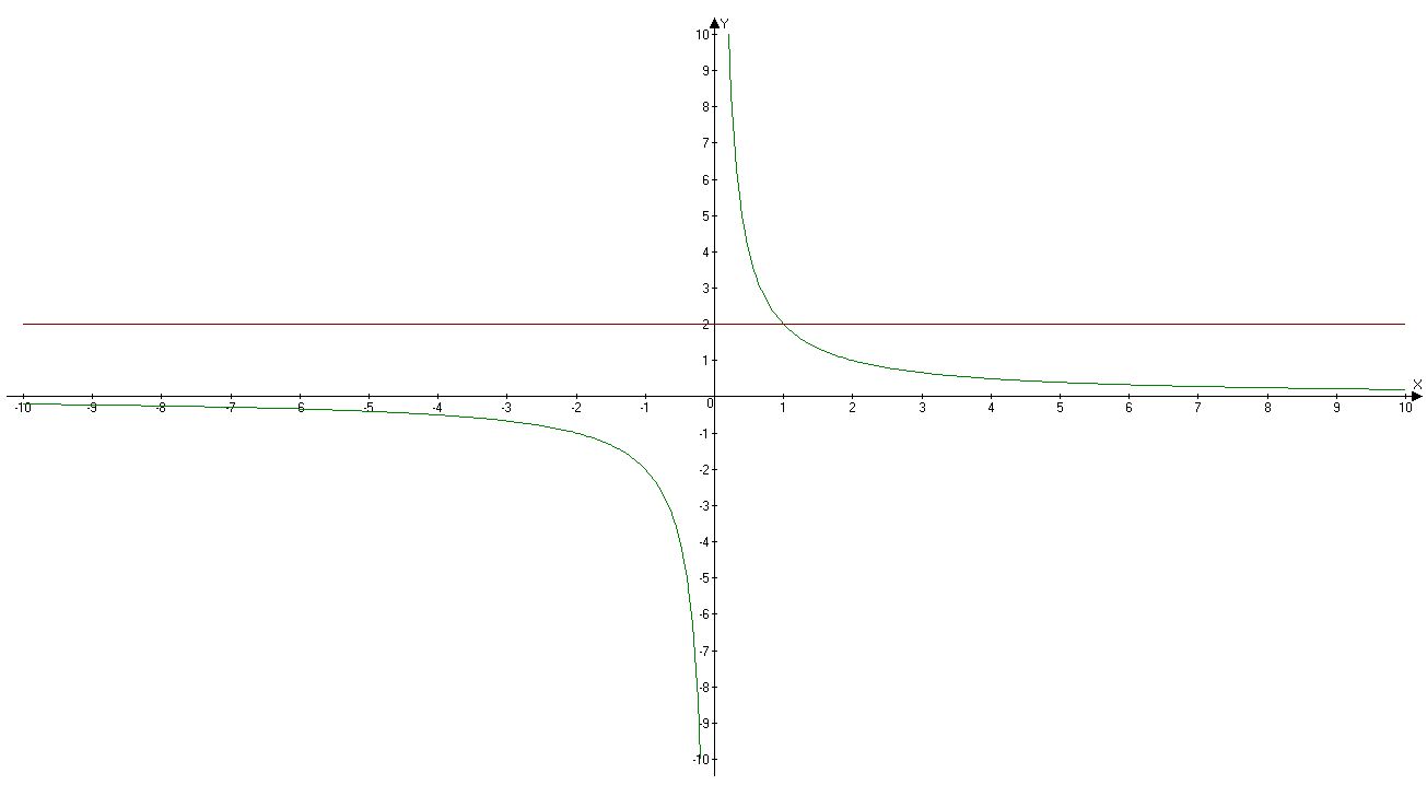 Рисуем график двух частей уравнения у= 2/х и у = 2