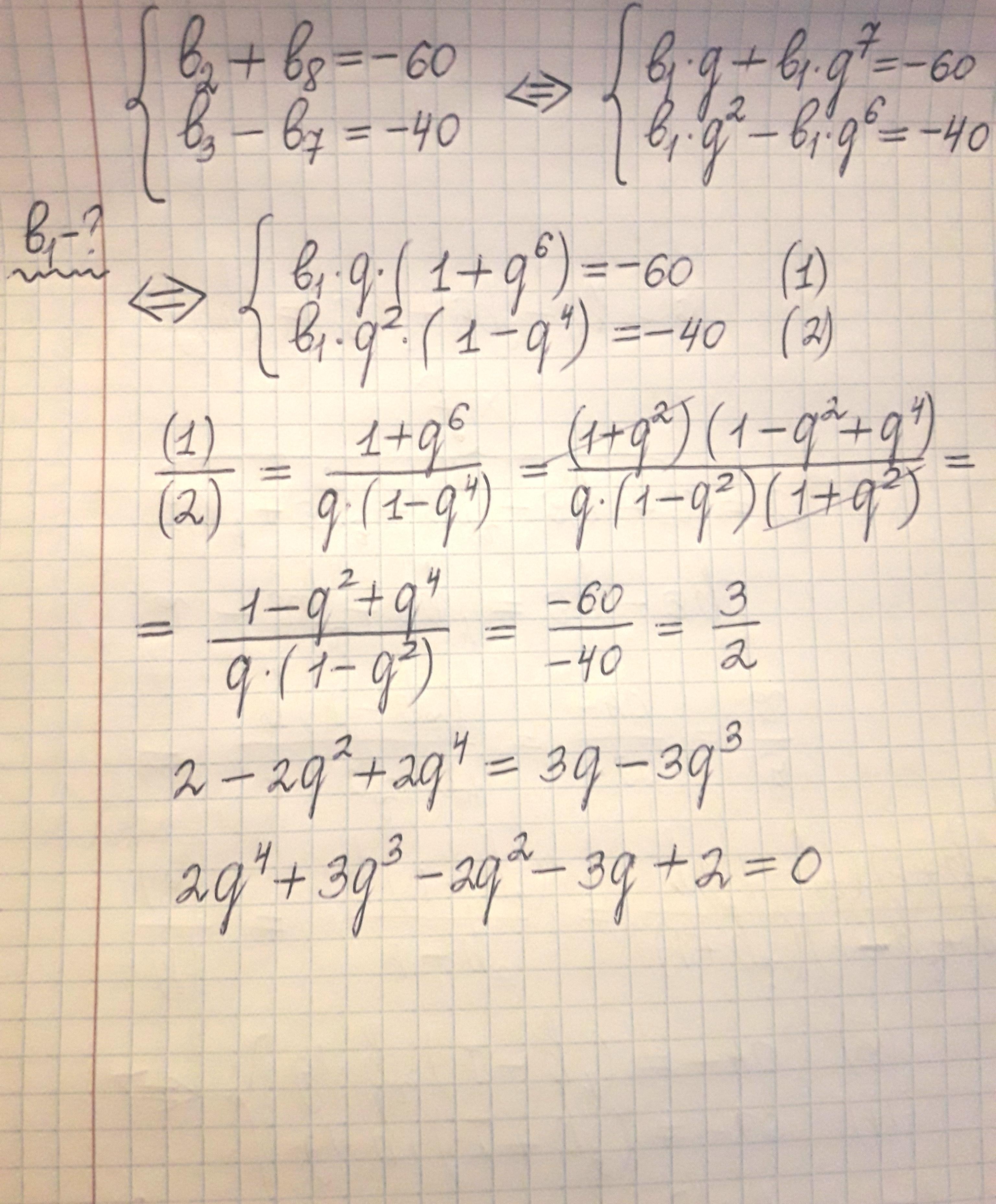 Г) значение суммы второго и восьмого членов геометрической прогрессии равно -60 , разность третьего и седьмого равно -40. Найдите первый член прогрессии.