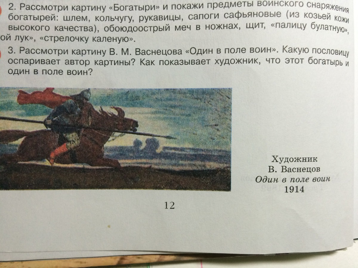 Рассмотри картину В. М. Васнецова "Один в поле воин". Какую пословицу оспаривает автор картины? Как показывает художник, что этот богатырь и один в поле воин?