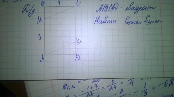 Квадрат АВСД: АВ=ВС=СД=АД=4; АМ=3, КД=1