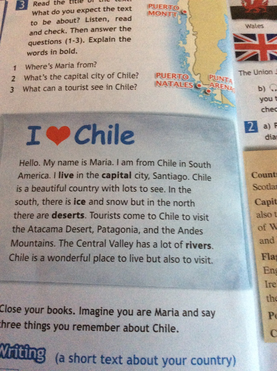 Hello. My name is Maria. I am from Chile in SouthAmerica. I live in the capital city, Santiago. Chileis a beautiful country with lots to see. In thesouth, there is ice and snow but in the norththere are deserts. Tourists come to Chile to visitthe Atacama Desert, Patagonia, and the AndesMountains.The Central Valley has a lot of rivers.Chile is a wonderful place to live but also to visit.