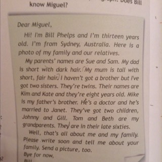 имена моих родителеф суе и сэм.мой папа короткого роста с тёмными волосами.моя мама высокого роста, с короткими светлыми волосами.у меня нет брата, но есть две сестры.они близнецы.их зовут ким и кэйт и им 8 лет.майк это мой папин брат.