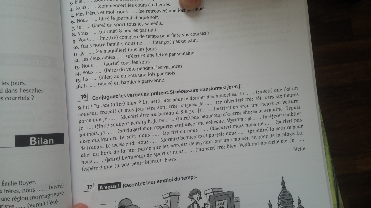 Tu vas, tu sais, je me reveille, je devois, je mets, je finis, je fais, je partage, je préfère, nous sortons, nous discutons, nous ne parlons pas, nous dormons, nous prdnnons, nous faisons, nous mangeons, j'éspère.