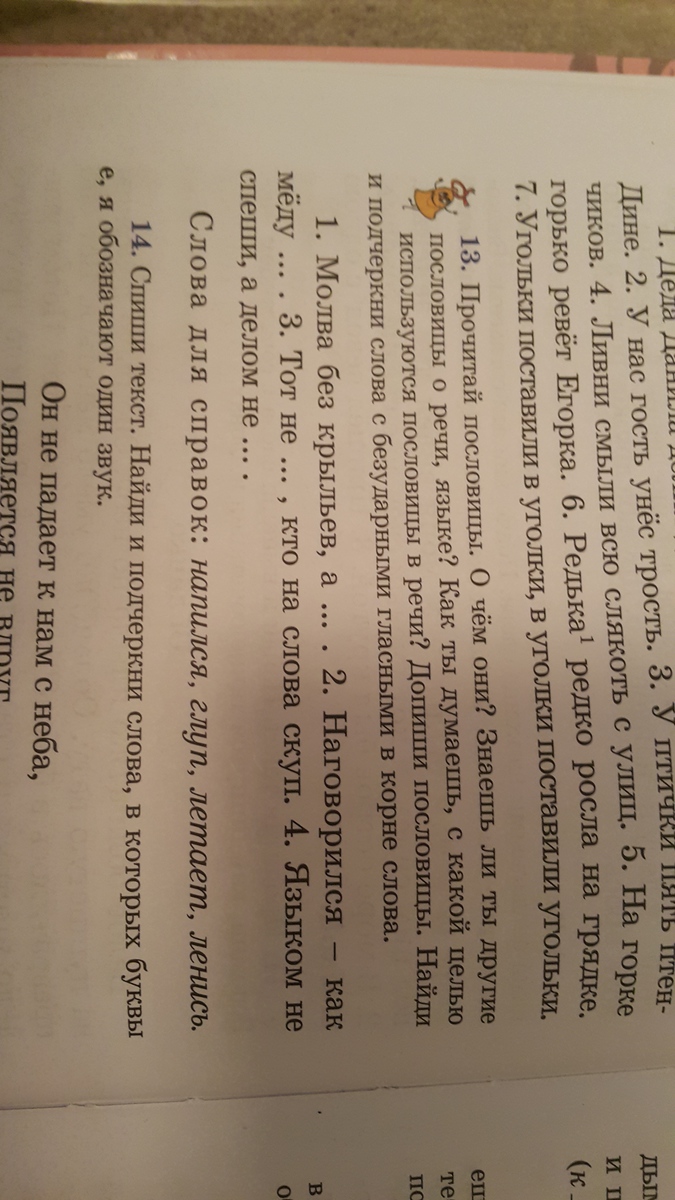 Допиши пословицы. Найди и подчеркни слова с безударными гласными в корне слова . упражнение 13