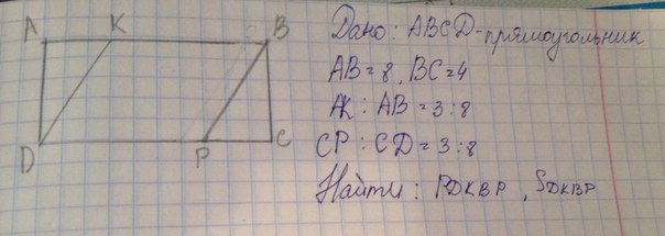 Очевидно, СР=АК=3.Площадь прямоугольника 32. От него отрезали 2 треугольника с катетами 3 и 4. Значит его площадь уменьшилась на 12. Искомая площадь равна 20.