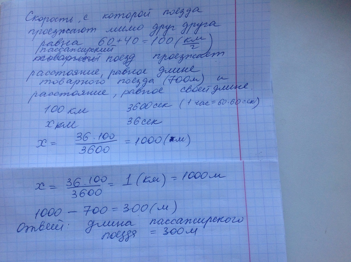 км/ч. Длина товарного поезда равна 700 метрам. Найдите длину пассажирского поезда, если время, за которое он прошел мимо товарного, равно 36 секундам. Ответ дайте в метрах.