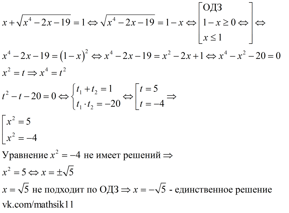 Перенесите x в правую часть уравнения, и возведите уравнение в квадрат при условии положительности правой части. После возведения в квадрат получается уравнение x^4−2x−19=1−2x+x^2. Перенесите все в одну сторону, и решите получившееся биквадратное уравнение.